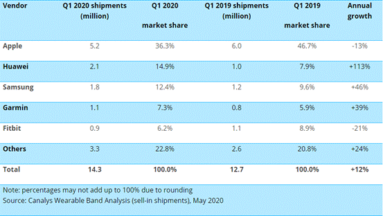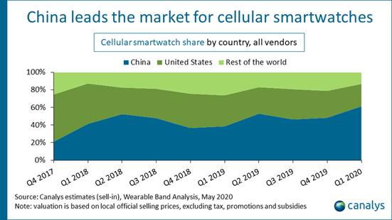 2020年第一季度,中國的智能手表出貨量增長了66%,與北美的出貨量相媲美。研究分析師Cynthia Chen表示:"供應(yīng)商在春節(jié)前填補(bǔ)了巨大的LTE訂單,作為向全國eSIM覆蓋的一部分,出貨了250萬塊蜂窩智能手表。蜂窩機(jī)型使小米和蘋果的智能手表出貨量逐季增長,這是前所未有的,因?yàn)榈谒募径仁侵袊鴤鹘y(tǒng)的智能手表銷售旺季。我們預(yù)計(jì),由于中國經(jīng)濟(jì)強(qiáng)勁復(fù)蘇,以及包括華為、小米和新進(jìn)Oppo在內(nèi)的本土廠商加大推動力度,中國將成為2020年智能手表增長的主要動力。"