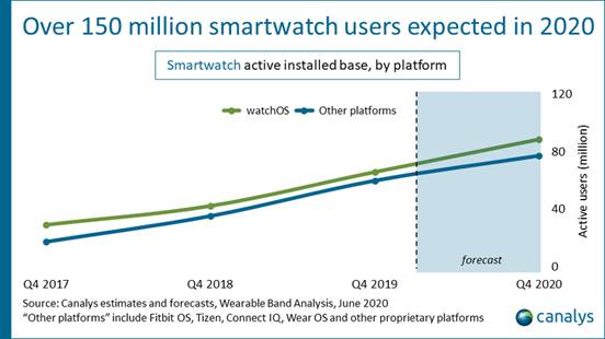 2020年第一季度全球智能手表出貨量達(dá)到1430萬臺,同比增長12%,盡管COVID-19。雖然蘋果的出貨量下降了13%,但其智能手表平臺仍然是世界上最大的平臺,并且正在穩(wěn)步增長。WatchOS在本季度獲得了400萬新的活躍用戶,使總裝機(jī)量估計(jì)達(dá)到7000萬。在未來三個月內(nèi),Apple Watch的終身出貨量將達(dá)到1億臺。
