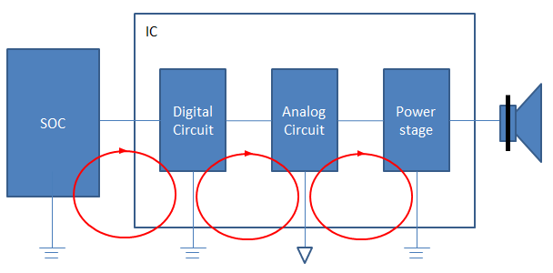 在芯片內(nèi)部,模擬和數(shù)字域需要相互通信。 下面的紅色環(huán)路是地電流。 這意味著存在從不同接地流入和流出的返回電流。 由于這些接地回路電流和每個(gè)電路之間的連接阻抗,以避免噪聲從數(shù)字電路耦合到模擬電路。 建議使用不同的接地以避免開(kāi)關(guān)耦合通過(guò)地面的噪聲, 即使連接一個(gè)小電阻來(lái)增加分離也可