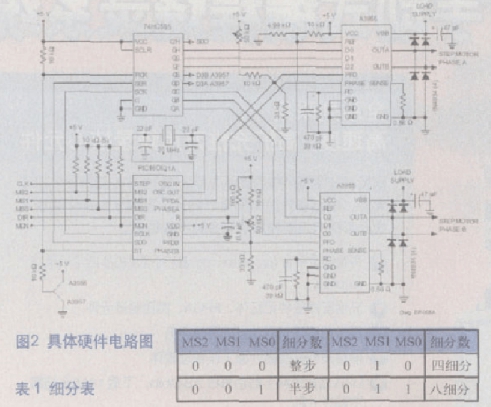 具體硬件如圖2,CLK 為外部脈沖輸入端,DIR為外部方向輸入端,步進(jìn)脈沖信號(hào)CLK用于控制步進(jìn)電機(jī)的位置和速度,本驅(qū)動(dòng)器的設(shè)計(jì)為CLK信號(hào)為上升沿有效,要求CLK信號(hào)的驅(qū)動(dòng)電流為8-15mA,對(duì)CLK的脈沖寬度也有一定的要求,一般不小于5mS。方向電平信號(hào)DIR用于控制步進(jìn)電機(jī)的旋轉(zhuǎn)方向。此端為高電平時(shí),電機(jī)逆時(shí)針?lè)较蜣D(zhuǎn),此端為低電平時(shí),電機(jī)為順時(shí)針?lè)较蜣D(zhuǎn)。CLK和DIR信號(hào)默認(rèn)幅值為5V,如果不是5V則須外部另加限流電阻R,如信號(hào)幅度為12V時(shí),加680W的電阻。MS0,MS1,MS2 為細(xì)分輸入端,最多為8細(xì)分(見(jiàn)表1)。