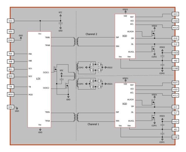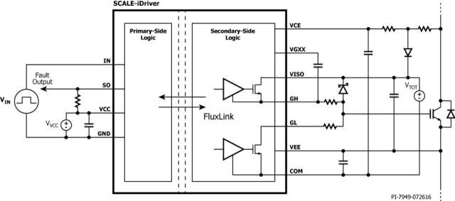 該公司的SID11x2K系列以標(biāo)準(zhǔn)eSOP封裝的單通道IGBT和MOSFET驅(qū)動(dòng)器為代表。該系列采用固體絕緣體FluxLink技術(shù)提供增強(qiáng)型電氣隔離。其8 A峰值輸出電流能夠驅(qū)動(dòng)高達(dá)600 A(典型值)的設(shè)備,而無(wú)需任何其他有源組件。