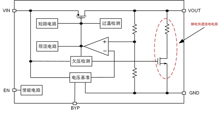 圖1為實(shí)際應(yīng)用中某普通LDO電路,該電路輸入輸出端均有較大的電容連接。該LDO是一個(gè)普通的LDO,在上下電過程中基本可以看成是輸出跟隨輸入的。當(dāng)LDO輸入端掉電,輸出端電容的殘存電荷得不到快速釋放時(shí),會(huì)造成LDO輸出端掉電緩慢。