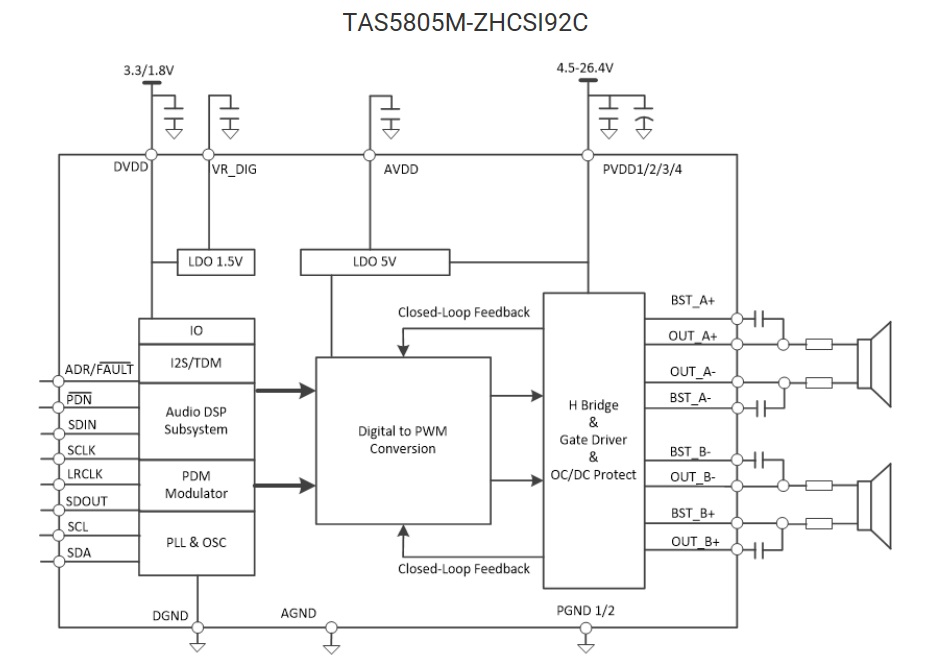 TAS5805M 是一款高效立體聲閉環(huán)D 類放大器,可提供具有低功率耗散和豐富聲音的低成本數(shù)字輸入解決方案。該器件的集成音頻處理器和96kHz 架構(gòu)支持高級(jí)音頻處理流程(包括SRC、每通道15 個(gè)BQ、音量控制、音頻混合、3 頻帶4 階DRC、全頻帶AGL、THD管理器和電平計(jì))。