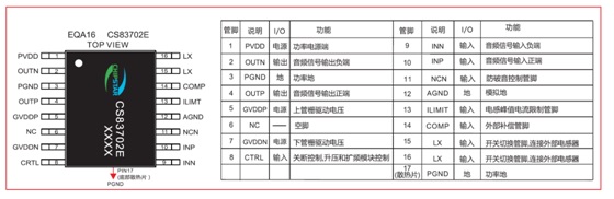 CS83702工作電壓范圍是2.7V~5.5V,采用EAQ16封裝,尺寸大小與ESOP-8一致;針對不同的應用場合、不同的喇叭腔體需求、CS83702內(nèi)置三種防破音模式可選,靈活方便;另外擴頻工作模式在整機EMI認證測試時變得很輕松;AB/D類切換免除收音干擾;CS83702除了性能指標優(yōu)秀、音質(zhì)表現(xiàn)突出、應用簡單靈活之外,還有著完善的保護機制,包括過流保護、過熱保護、輸出短路保護等,實測輸出正負兩端短路、輸出對地短路、輸出對電源短路保護功能準確無誤。