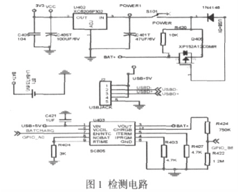 在本文中檢測(cè)電路僅僅列出鋰電池檢測(cè)電路的原理圖,該設(shè)計(jì)考慮到了鋰電池的過壓特性,于是選用 SC805 電池檢測(cè)芯片來進(jìn)行硬件電路的設(shè)計(jì)。如下圖所示,電路圖一部分是對(duì)于 USB 充電和過壓的保護(hù)設(shè)計(jì),另一部分為電池電量檢測(cè)