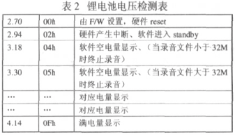 在 ATJ2085 中,電池電壓從電池電壓檢測(cè)引腳 VBATPIN 輸入,VBAT 的電壓范圍小于 3.0 伏,所以無論一節(jié)堿性電池(1.5V)供電還是兩節(jié)堿性電池(3.0V)供電,在外部電池供電電壓小于 3.0 伏時(shí)外部都無需要加分壓電阻。ATJ2085 中有一個(gè) 4bit 的 ADC,它把 0.9-1.5 伏之間的電壓 16 等分為:0.90V,0.94V,0.98V,1.02V,1.06V,1.10V,1.14V,1.18V,1.22V,1.26V,1.30V,1.34V,1.38V,1.42V,1.46V,1.50V。當(dāng)電池電壓大于 3.0 伏供電時(shí),BATSEL 接高電平,決定了從 VBATPIN 腳輸入的電壓在比較前會(huì)被分壓。并且 A/D 變換出來的數(shù)值會(huì)每 2 秒一次被記錄在 IO PORT(D8H).BIT[3:0]里,這樣軟件就可以讀回 IO PORT(D8H)中的值,與功能規(guī)格表(表 1)中的值作比較,來確定要顯示的電池電量及采取的動(dòng)作。很明顯 ATJ2085 能在更多點(diǎn)上監(jiān)測(cè)電池電壓。