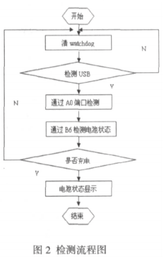 首先清 watchdog,然后通過 GPIO_A0 檢測(cè) USB 狀態(tài),接下來進(jìn)行充電引腳 GPIO 確認(rèn)并開始充電,充電時(shí)將 GPIO_A0(如檢測(cè)電路圖)寄存器的對(duì)應(yīng)位置高電平,同時(shí)利用 GPIO_B6 進(jìn)行電池狀態(tài)檢測(cè)[6][7]。當(dāng)需要對(duì) 4 位 ADC 寄存器讀寫數(shù)據(jù)時(shí),需要設(shè)置其端口值參數(shù),通過電池狀態(tài)檢測(cè)后,最后將檢測(cè)到的電池參數(shù)通過顯示函數(shù)顯示在 LCD 上。