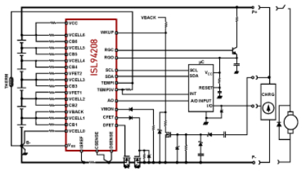 ISL94208用作微控制器,并且在多單元鋰電池組中作過流保護模擬前端。