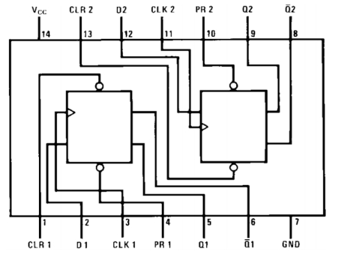 這里的7474我們使用的是仙童的DM74S74N,這是一個雙D觸發(fā)器,其中內(nèi)含兩個D觸發(fā)器,既可以單獨使用也可以實現(xiàn)主從組合。這個電路中我們只需使用其中的一個D觸發(fā)器。第一個觸發(fā)器的引腳在左邊,第二個觸發(fā)器的引腳在右邊。其中還有PRE和CLR引腳,這些是D觸發(fā)器的低電平有效引腳。它們可以分別用來設(shè)置或重置D觸發(fā)器,而不用考慮輸入D和時鐘。我們將其與Vcc相連好讓它們處于閑置狀態(tài)。