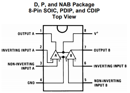該設(shè)計加入了可調(diào)的過流閾值,同時還有失效時自動重啟功能。因?yàn)檫@是一個基于運(yùn)放的過流保護(hù)電路,所以我們加入了運(yùn)放作為驅(qū)動,這里用的是常見的LM358。下圖為LM358的引腳圖。