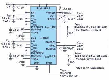 LT3072在單個封裝中集成了兩個完全獨立的2.5 A LDO穩(wěn)壓器。LT3072的0.6 V至2.5 V輸出電壓范圍足夠?qū)挘軌驗楦鞣N數(shù)字IC供電軌供電。在LT3072上設(shè)置幾個三態(tài)引腳,可編程設(shè)定每個通道的輸出電壓,這可通過跳線、微控制器或電源系統(tǒng)管理(PSM) IC輕松實現(xiàn)。