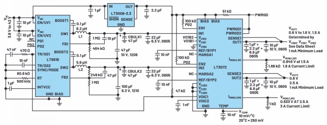 圖3中LT3072的前置穩(wěn)壓器電源采用LT8616,這是一款42 V、雙通道1.5 A/2.5 A同步單片降壓穩(wěn)壓器。此設(shè)置可接受單個3.6 V至42 V系統(tǒng)輸入電壓范圍。在此解決方案中,LT3072的OUT1的可編程輸出范圍為0.6 V至1.8 V。OUT1通道使用VIOC控制相應(yīng)的LT8616輸出,使LDO穩(wěn)壓器在最佳效率和瞬態(tài)響應(yīng)轉(zhuǎn)換范圍內(nèi)工作。使用VO1B2-1引腳可在0.6 V至1.8 V之間動態(tài)調(diào)整OUT1。