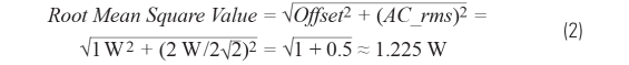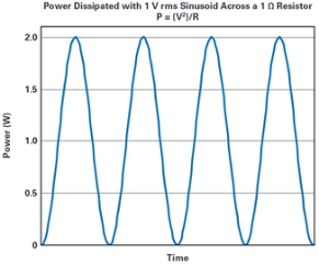 圖2所示為1 V rms正弦電壓施加于1 Ω電阻(P = V2/R)時(shí)的消耗功率曲線圖,其中顯示: