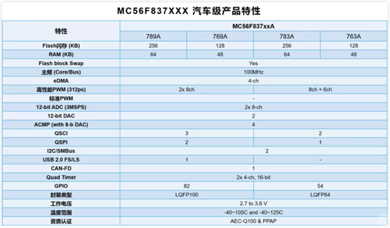 56F83xxx系列新增8個汽車級產(chǎn)品, 命名為56F837xxA系列。56F837xxA系列通過了AEC-Q100第一級和第二級的安全認(rèn)證,對應(yīng)的工作溫度范圍為第二級:-40~105°C;第一級:-40~125°C。具體產(chǎn)品組合如下圖: