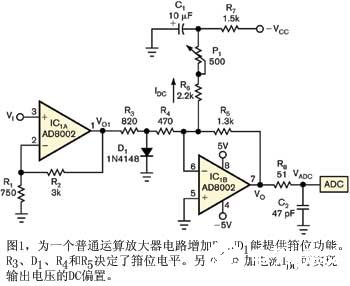 許多快速ADC都推薦0.6V“2.6V輸入電壓范圍,如美國國家半導(dǎo)體公司的ADC1175(參考文獻(xiàn)1)。但在某些應(yīng)用中,必須要轉(zhuǎn)換一個(gè)對(duì)稱的模擬輸入信號(hào)。本設(shè)計(jì)實(shí)例中的電路將一個(gè)-0.2V ” +0.2V范圍的對(duì)稱輸入電壓轉(zhuǎn)換到推薦的0.6V“2.6V范圍(圖1)。該電路亦能防止輸出電壓低于-0.3V,以防止損壞ADC。