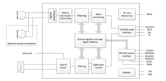 與麥克風(fēng)的接口長(zhǎng)期以來(lái)一直由語(yǔ)音編解碼器實(shí)現(xiàn),但傳統(tǒng)的編解碼器被設(shè)計(jì)為與駐極體麥克風(fēng)兼容,而不兼容現(xiàn)代數(shù)字MEMS麥克風(fēng)。之前的語(yǔ)音編解碼器缺少與MEMS麥克風(fēng)端接所需的許多功能,其中包括抽取濾波(decimation filtering),其作用是將PDM轉(zhuǎn)換為PCM格式以便進(jìn)一步處理。此外,在包括揚(yáng)聲器和麥克風(fēng)陣列在內(nèi)的許多應(yīng)用中,具有更高效率的D類放大器已成為任何MEMS麥克風(fēng)接口的重要組成部分。
