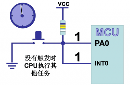 問(wèn)題出在去檢測(cè) I/O 口這個(gè)過(guò)程,CPU 必須每隔一段時(shí)間檢測(cè),一般用定時(shí)器去實(shí)現(xiàn),間隔時(shí)間太長(zhǎng)了達(dá)不到實(shí)時(shí)的性能,時(shí)間太短了有浪費(fèi) CPU 資源,因?yàn)樵诤芏鄨?chǎng)合按鍵處于觸發(fā)的時(shí)間段時(shí)相當(dāng)少的,比如學(xué)校的自動(dòng)圈存機(jī),一般情況下時(shí)沒(méi)人用的,那就意味著 CPU 每間隔時(shí)間去查看 I/O 是非常不合理的,只有當(dāng)按鍵按下采取查看,這才是 合理的方式。