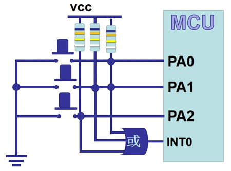 如果有兩個(gè)甚至多個(gè)按鍵,那如何弄了,很簡(jiǎn)單,使用或門來(lái)解決這個(gè)問(wèn)題。電路圖如下:
