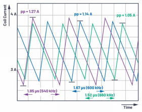 圖2.受開關頻率變化影響的峰到峰線圈電流紋波