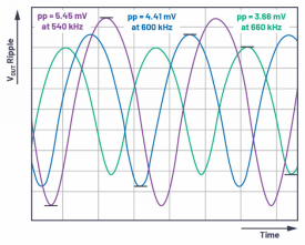 圖3.在開關模式穩(wěn)壓器IC中,開關頻率變化導致的輸出電壓紋波變化