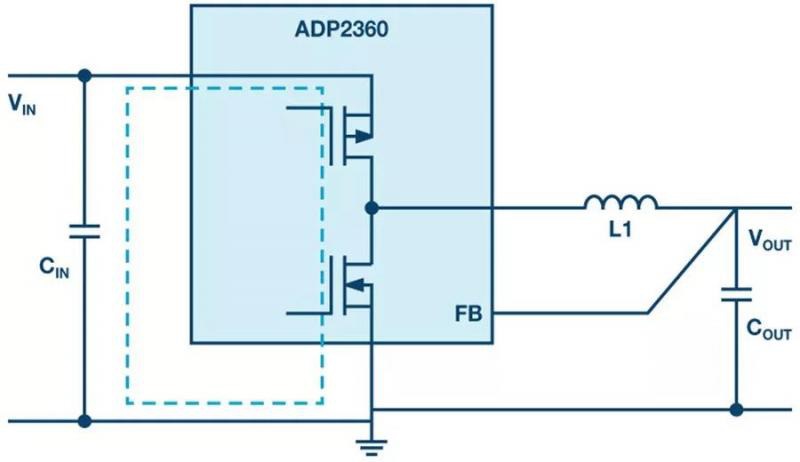 圖 1. 用于降壓轉(zhuǎn)換的開關(guān)穩(wěn)壓器(帶如虛線所示的關(guān)鍵熱回路)。