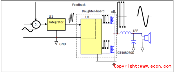 The EVAL_AUDAMP24 self-oscillating topology consists of the following essential functional blocks: