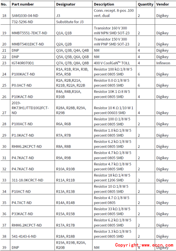 infineon公司的IGT40R070D1 E8220是400V Cool增強模式氮化鎵高遷移率晶體管(GaN HEMT).該器件通過在體二極管的零反向恢復電荷和非常小的線性輸入和輸出電容,克服了技術阻擋層如線性和功率損耗.CoolGaN™由于具有低/線性Coss,零Qrr和常開開關,理想的D類音頻放大器提供0%失真和100%效率.D類放大器線性和功率損耗是高度依賴于開關器件的開關特性. Infineon公司的CoolGaN™通過引入體二極管的零反向恢復電荷和非常小的線性輸入和輸出電容,打破了這種技術壁壘.此外,增強模式提供了快速開合和關斷速度,以及在單個芯片或封裝內更好的集成通路.這種特性使得CoolGaN™和IRS20957SPBF D類控制器配對時更簡便,能是客戶更快的設計和更早走向市場.本文介紹了IGT40R070D1 E8220主要特性,電感負載開關時間測試電路以及采用IRS20957SPBF + IGT40R070D1 E8220評估板EVAL_AUDAMP24主要特性,主板和子板電路圖,材料清單和PCB設計圖.