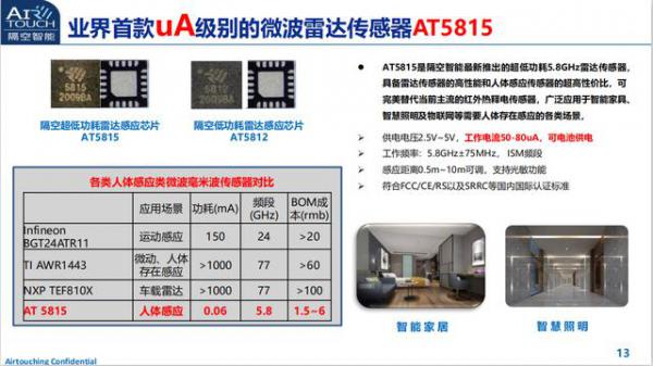 此次隔空智能最新推出的AT5815是全球首款超低功耗微波雷達傳感器,具備雷達傳感器的高性能和紅外傳感器的超高性價比,是一種新型人體感應類傳感器,也是傳統(tǒng)紅外熱釋電傳感器升級換代的首選,可廣泛應用于智能家具、智慧照明及安防監(jiān)控等需要人體存在感應的各類場景。