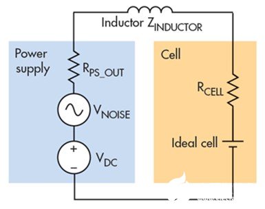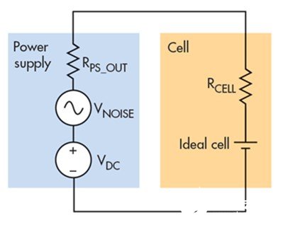 電池充電電源輸出端存在電壓噪聲。量程10 V的電源輸出噪聲為10 mV峰峰值是很普遍的。圖 3 描繪了電池和電源的簡單模型,標(biāo)明了阻抗和噪聲源。頻率低于 100 Hz 時,RPS_OUT 趨近 0 Ω。電源的輸出電壓噪聲表現(xiàn)為與直流輸出串聯(lián)的交流電壓源。該交流電壓(即噪聲)又表現(xiàn)為通過電池內(nèi)部較低阻值的串聯(lián)電阻的交流電流,根據(jù)歐姆定律:INOISE = VNOISE / (RPS_OUT + RCELL)。