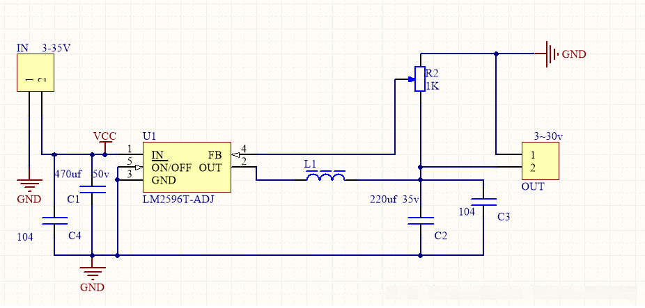 順帶介紹一下LM2596.LM2596系列是德州儀器(TI)生產(chǎn)的3A電流輸出降壓開關型集成穩(wěn)壓芯片,它內(nèi)含固定頻率振蕩器(150KHZ)和基準穩(wěn)壓器(1.23v),并具有完善的保護電路、電流限制、熱關斷電路等。利用該器件只需極少的外圍器件便可構成高效穩(wěn)壓電路。提供的有:3.3V、5V、12V及可調(diào)(-ADJ)等多個電壓檔次產(chǎn)品。有關電路直接下載datasheet即可知道。我自己用過的電路如下: