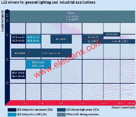 對于高功率LED而言, 開關(guān)模式驅(qū)動器是最常用的LED驅(qū)動器。英飛凌推出用于驅(qū)動高功率LED的全新ILD4xxx降壓轉(zhuǎn)換器。具備350mA典型輸出電流的ILD4035經(jīng)過專門設計,可用于驅(qū)動1W LED。對于3W以上LED而言,英飛凌推出輸出電流分別為1200mA和1800mA的ILD4120和ILD4180。