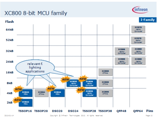 除微控制器外,英飛凌還提供加速硬件和軟件開發(fā)的多種開發(fā)工具,從確保快速評估ACD和CCU6等主要特性的USB入門級工具套件到可配置微控制器管腳的簡易套件,所有套件都具備完整的工具鏈。憑借全新的XC82x和XC83x系列,英飛凌將可推出基于Eclipse的免費新工具鏈DAVE Bench。適用于照明解決方案的應用套件目前正在開發(fā)當中,以用于展示整個解決方案,包括微控制器、功率半導體和軟件。 |