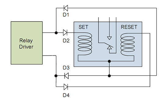 圖1:二極管可將單線圈繼電器驅(qū)動器轉(zhuǎn)換為雙線圈使用。