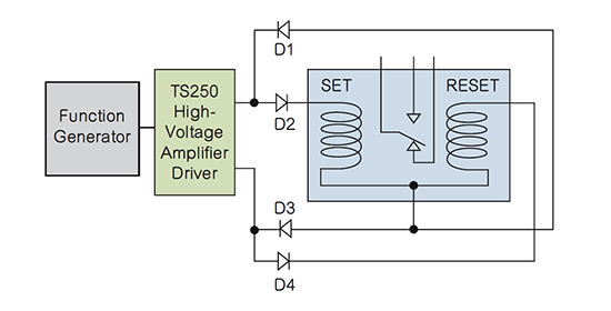 圖3:僅使用一個函數(shù)發(fā)生器和一個高壓驅(qū)動器來測試雙線圈繼電器。