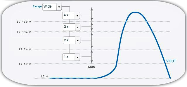 在圖3的示例中,設(shè)置的標(biāo)稱輸出電壓為12 V?烧{(diào)控制環(huán)路增益可以設(shè)置為多個(gè)值,具體由輸出電壓決定。例如,如果因?yàn)檎`差放大器的增益增加,使得電壓升高至12.12 V以上,則可以在對(duì)應(yīng)的下拉菜單中設(shè)置控制環(huán)路。還有三個(gè)其他的電壓閾值高于12.12 V,可以使用獨(dú)立的增益設(shè)置。注意,這些增益設(shè)置與在設(shè)計(jì)穩(wěn)壓環(huán)路時(shí)設(shè)置的極點(diǎn)和零完全無關(guān)。