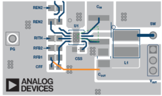 圖2所示為ADP2360的示例布局。在本圖中,圖1中的重要熱回路標為綠色。從圖中可見,黃色反饋路徑離線圈L1有一定距離。它位于PCB的內(nèi)層。