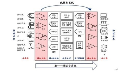 常見的數(shù);旌舷到y(tǒng)包括:消費領(lǐng)域的手機、個人電腦、數(shù)碼相機、麥克風(fēng)、揚聲器等,工業(yè)領(lǐng)域的溫度檢測器、心電圖儀、飛機系統(tǒng),汽車領(lǐng)域的倒車顯示儀等,模擬芯片無處不在。
