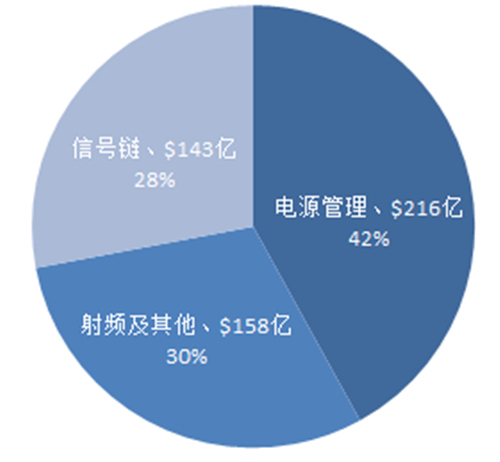 在模擬集成電路中,電源管理是最大的市場,規(guī)模約216億美元,占比42%;信號鏈?zhǔn)袌?43億美元(28%),射頻及其他產(chǎn)品市場約158億美元,占比30%。