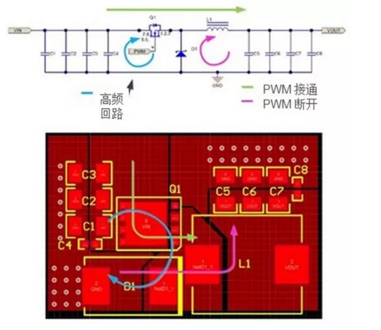 除了這些基本的布局規(guī)則,我通常首先會(huì)識(shí)別開(kāi)關(guān)回路,然后確定哪些回路具有高頻開(kāi)關(guān)電流。圖1所示為針對(duì)降壓電源(原理圖和布局)的簡(jiǎn)化功率級(jí)的一個(gè)示例。
