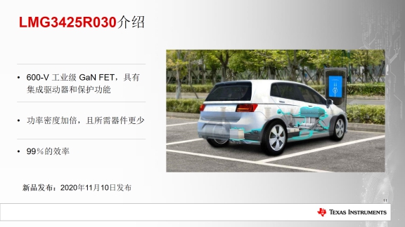 近日,德州儀器(TI)推出其首款帶集成驅(qū)動(dòng)器、內(nèi)部保護(hù)和有源電源管理的GaN FET,分別面向車用充電器和工業(yè)電源,可以實(shí)現(xiàn)2倍的功率密度和高達(dá)99%的效率,并將電動(dòng)汽車充電器中的電源磁性器件尺寸和車載充電器尺寸分別縮小了59%和50%。