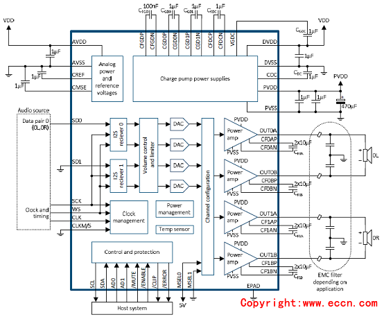 Highly flexible output stage configurations are offered,ranging from four single-ended outputs to a singleparallel-BTL output.