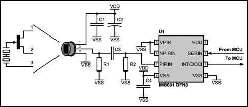 圖4的方案是內(nèi)部集成式了M8601芯片的PIR數(shù)字探頭。探頭與外部電路只需4個(gè)引腳相連,即電源VDD,“地”VSS,探頭配置端口SERIN, 以及中斷及信號(hào)輸出口INT/DOCI。系統(tǒng)上電之后,外部單片機(jī)首先通過SERIN接口對(duì)數(shù)字探頭進(jìn)行編程和配置,然后根據(jù)相應(yīng)的配置模式,通過INT/DOCI輸出對(duì)應(yīng)的信號(hào)。相比之前的數(shù)字探頭,采用M8601芯片的探頭功耗大大降低,外部電路也僅需要在靠近VDD引腳的地方增加一個(gè)陶瓷電容即可,電路非常簡單。同時(shí),獨(dú)特的防誤觸發(fā)功能以及自檢功能也為終端用戶以及探頭廠家?guī)順O大的便利,不但提升產(chǎn)品性能的也節(jié)約了后續(xù)的檢測(cè)成本。 |