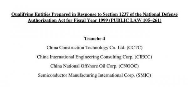 12月4日早間消息,當(dāng)?shù)貢r間周四,美國國防部官網(wǎng)宣布根據(jù)經(jīng)修訂的《 1999財政年度國防授權(quán)法》第1237條的法定要求,正式將中芯國際(SMIC)、中國建設(shè)科技集團(CCTC)、中國國際工程咨詢公司(CIECC)、中海油(CNOOC)四家中國企業(yè)加入“軍事最終用戶”(Military End-User),此舉將使得美國企業(yè)在向這四家企業(yè)供應(yīng)相關(guān)技術(shù)或產(chǎn)品時,需要獲得美國的許可。