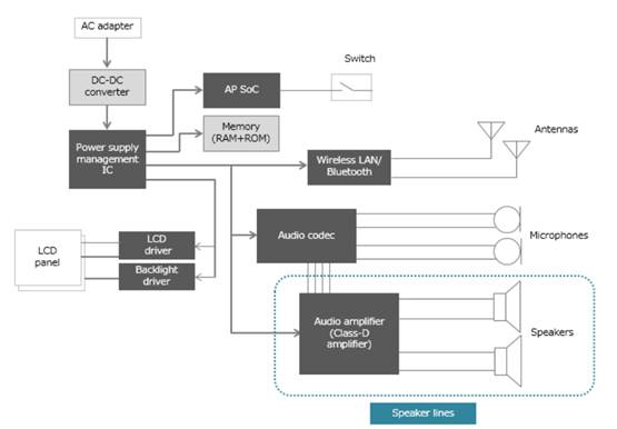 對于揚(yáng)聲器輸出為2 W至20 W等級的設(shè)備,例如AI揚(yáng)聲器,平板電腦和其他音頻設(shè)備,有必要在外部為LPF提供電感以容納大電流。考慮這些電感器已插入揚(yáng)聲器線路,因此它們不得影響這些線路中的信號。