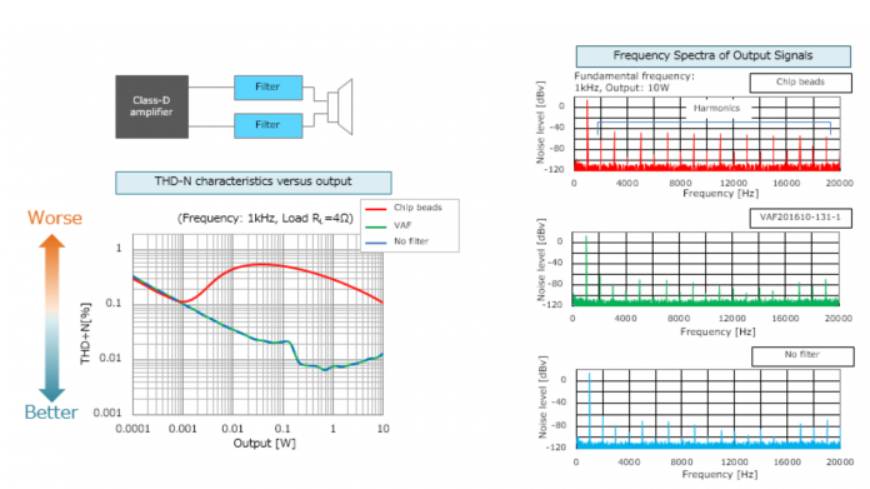 與不使用濾波器相比,噪聲抑制濾波器在輻射噪聲抑制方面的效果等同于關(guān)閉D類放大器時的效果。例如,TDK的MAF系列濾波器是多層芯片組件,它們使用一種新型的鐵氧體材料來實現(xiàn)低失真,同時保持其噪聲消除特性。