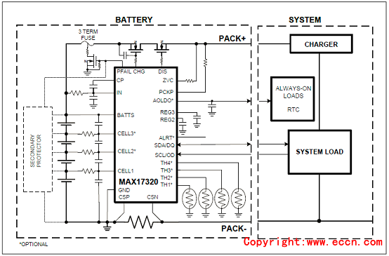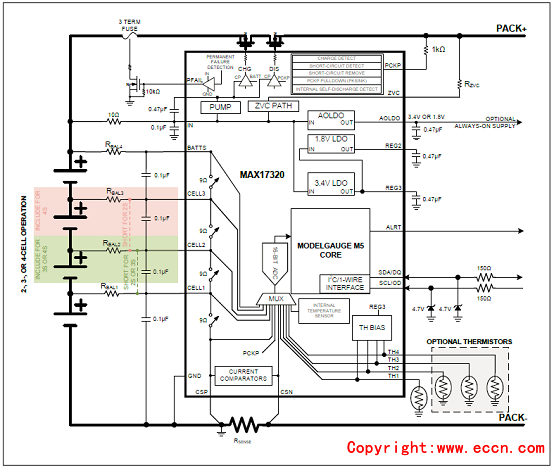 圖3.MAX17320 2S-4S電池組和系統(tǒng)實(shí)現(xiàn)圖