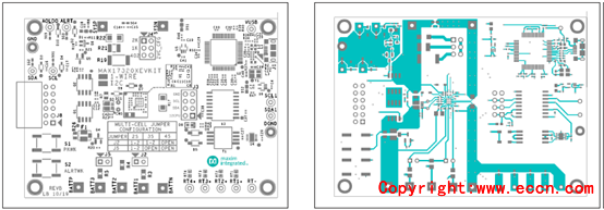 圖11.評估板MAX17320X EVK PCB設(shè)計(jì)圖:左:底層;右:底層絲印