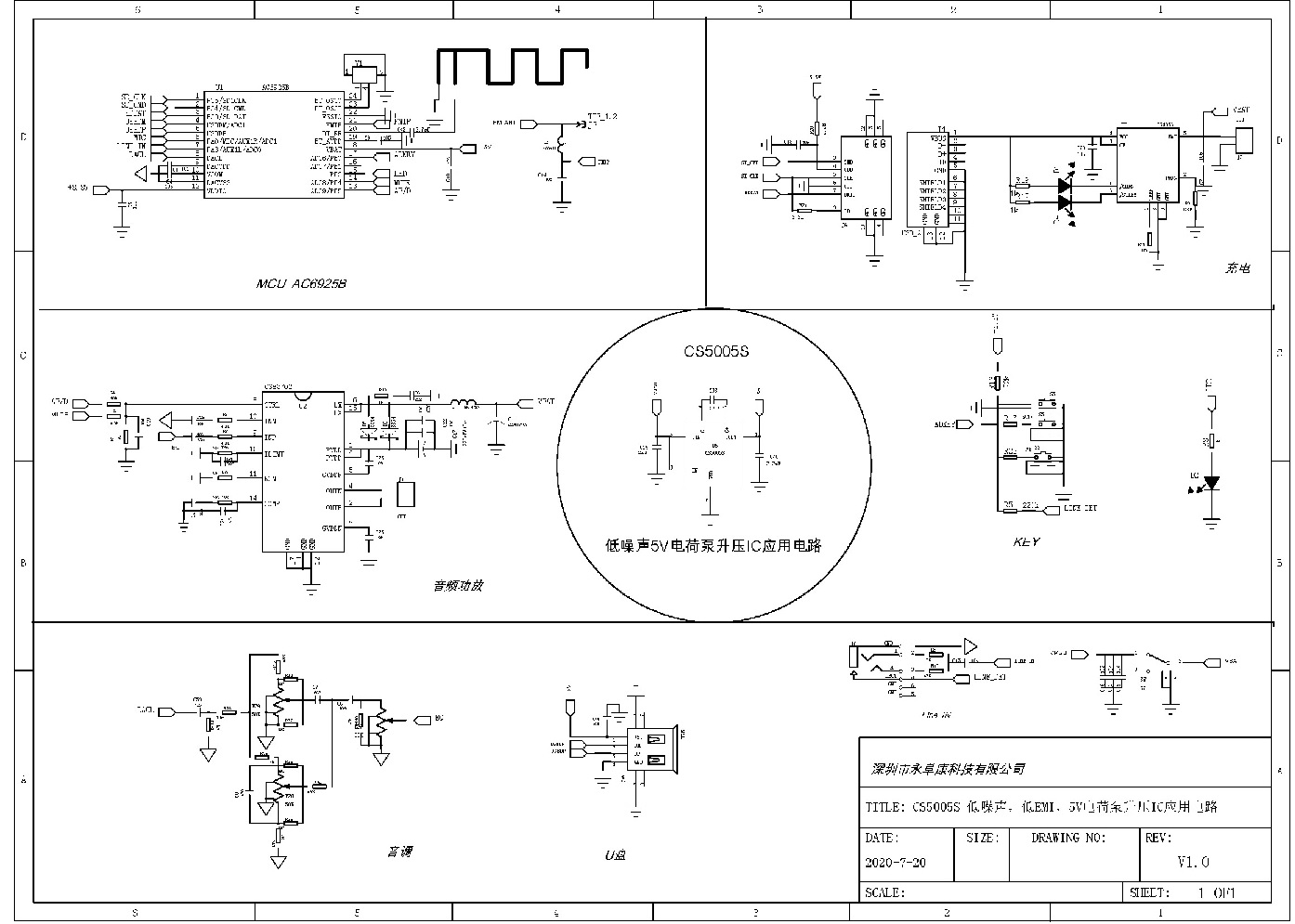 5V是很多器件以及電路標(biāo)準(zhǔn)的供電電壓。針對(duì)音箱的應(yīng)用場(chǎng)景,一般帶LED顯示屏主控供電電流約50mA,無線麥接收板電流約100mA,加上U盤等其他電路一起最大電流約200mA。另外還必須考慮升壓輸出紋波以及噪聲,不然會(huì)影響系統(tǒng)的信噪比。再有就是EMI特性,直接影響FM收音效果以及無線麥接收距離和清晰度,考慮外圍成本,EMI輻射干擾,電荷泵升壓方式是最佳選擇。