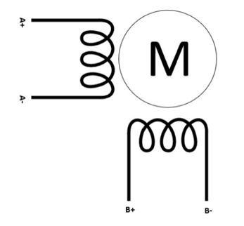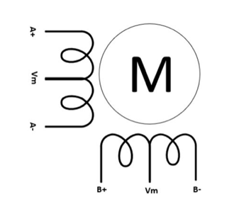 相反,雙極步進(jìn)電機只有四根導(dǎo)線連到電機繞組,分別標(biāo)記為A+、A-、B+和B-。如圖3所示,雙極步進(jìn)電機沒有中心Vm抽頭。
