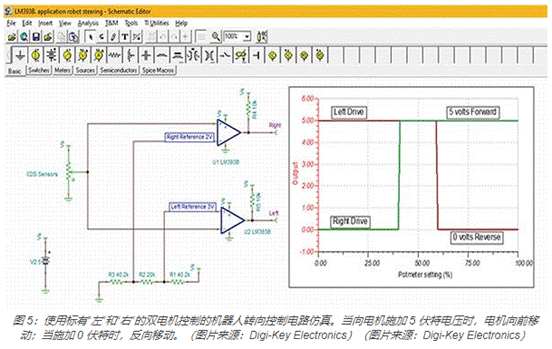 窗口可用于機(jī)器人技術(shù),通過(guò)光線和兩個(gè) CDS 光電管來(lái)控制機(jī)器人的移動(dòng)方向。例如,硫化鎘 (CDS) 光電池在燈光下會(huì)改變電阻,黑暗環(huán)境下電阻較高而燈光下則電阻較小。TINA-TI 仿真使用 Texas Instruments LM393BIPWR 雙比較器說(shuō)明了這一原理(圖 5)。
